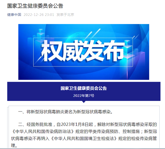 官宣!新冠肺炎更名为新冠病毒感染,1月8日起实施乙类乙管,取消入境后全员集中隔离,恢复中国公民出境游发表时间:2022-12-27 09:34 原标题 官宣!新冠肺炎更名为新冠病毒感染,1月8日起实施“乙类乙管”;取消入境后全员核酸检测和集中隔离,有序恢复中国公民出境游 国家卫健委26日晚发布公告: 一、将新型冠状病毒肺炎更名为新型冠状病毒感染。 二、经国务院批准,自2023年1月8日起,解除对新型冠状病毒感染采取的《中华人民共和国传染病防治法》规定的甲类传染病预防、控制措施;新型冠状病毒感染不再纳入《中华人民共和国国境卫生检疫法》规定的检疫传染病管理。 ![]() 《关于对新型冠状病毒感染实施 “乙类乙管”的总体方案》 解读问答 一、《总体方案》出台的背景是什么? 新型冠状病毒感染疫情发生以来,以习近平同志为核心的党中央高度重视疫情防控,全面加强对防控工作的集中统一领导,坚持人民至上、生命至上,因时因势动态优化调整防控措施,不断提高科学精准防控水平,经受住了全球疫情的多轮冲击,成功避免了致病力相对较强的原始株、德尔塔变异株等在我国的广泛流行,极大减少了重症和死亡,也为疫苗、药物的研发应用以及医疗等资源的准备赢得了宝贵的时间。我国疫情流行和病亡数保持在全球最低水平,人民健康水平稳步提升,统筹经济发展和疫情防控取得世界上最好的成果。 当前,国内外专家普遍认为新冠病毒变异大方向是更低致病性、更趋向于上呼吸道感染和更短潜伏期。奥密克戎变异株成为全球流行优势毒株,虽然感染人数多,但致病力较早期明显下降,所致疾病将逐步演化为一种常见的呼吸道传染病。综合考虑病毒特点、疫情形势、疫苗接种、医疗资源准备和防控经验等因素,我国已具备将新型冠状病毒感染由“乙类甲管”调整为“乙类乙管”的基本条件。我国新型冠状病毒感染疫情防控面临新形势新任务,防控工作进入新阶段。 二、《总体方案》中为何将“新冠肺炎”更名为“新型冠状病毒感染”?出于哪些考虑? 2020年1月20日,经报国务院批准后国家卫生健康委发布公告,将新型冠状病毒肺炎(简称“新冠肺炎”)纳入《中华人民共和国传染病防治法》规定的乙类传染病,并采取甲类传染病的预防、控制措施。当时命名为“新冠肺炎”,主要考虑疫情初期病例大部分有肺炎表现。随着奥密克戎变异株成为主要流行株以后,致病力减弱,仅有极少数病例有肺炎表现。考虑到肺炎仅反映了病毒感染后较为严重的患病状况,不能概括所有感染者临床特征,将“新冠肺炎”更名为“新型冠状病毒感染”,更加符合目前的疾病特征和危害。 三、《总体方案》对“乙类乙管”实施的时间进度安排是什么?如何平稳有序过渡?实施“乙类乙管”后的工作目标将做怎样的调整? 《总体方案》明确指出,2023年1月8日起,对新型冠状病毒感染实施“乙类乙管”。依据传染病防治法,对新冠病毒感染者不再实行隔离措施,不再判定密切接触者;不再划定高低风险区;对新冠病毒感染者实施分级分类收治并适时调整医疗保障政策;检测策略调整为“愿检尽检”;调整疫情信息发布频次和内容。依据国境卫生检疫法,不再对入境人员和货物等采取检疫传染病管理措施。 各地各部门要以习近平新时代中国特色社会主义思想为指导,充分发挥制度优势,坚持人民至上、生命至上,坚持科学防治、精准施策,完善应对准备,调整防控措施,统一规则、分类指导、防范风险,确保平稳有序实施“乙类乙管”。实施“乙类乙管”后,防控工作目标要围绕“保健康、防重症”,采取相应措施,最大程度保护人民群众生命安全和身体健康,最大限度减少疫情对经济社会发展的影响。 四、新型冠状病毒感染实施“乙类乙管”后,主要有哪些应对措施? 一是进一步提高老年人新冠病毒疫苗接种率,在重症高风险人群中推动开展第二剂次加强免疫接种。二是做好新型冠状病毒感染治疗相关药品和检测试剂准备,满足患者用药和检测需求。三是加大医疗资源建设投入,重点做好住院床位和重症床位准备。四是调整人群检测策略,社区居民根据需要“愿检尽检”,不再开展全员核酸筛查。五是根据疾病严重程度,分级分类救治患者。六是做好社区重点人群健康调查和分级服务,摸清辖区65岁及以上老年人合并相关基础疾病和疫苗接种情况,提供分类分级健康服务。七是强化养老机构、社会福利机构、医院、学校、学前教育机构、大型企业等重点机构防控,严防场所内聚集性疫情风险。八是加强农村地区疫情防控,为农村老年人、基础疾病患者等高风险人群提供就医保障。九是强化疫情监测与应对,研判疫情发展态势,依法动态采取适当的限制聚集性活动和人员流动等措施压制疫情高峰。十是倡导坚持个人防护措施,落实每个人都是自己健康第一责任人的理念。十一是做好信息公布和宣传教育,全面客观宣传解读将新型冠状病毒感染从“乙类甲管”调整为“乙类乙管”的目的和科学依据。十二是优化中外人员往来管理,来华人员在行前48小时进行核酸检测,取消入境后全员核酸检测和集中隔离,取消“五个一”及客座率限制等国际客运航班数量管控措施。 五、《总体方案》对进一步推动老年人新冠病毒疫苗接种是如何安排的? 疫苗接种是疫情防控的重要措施之一,是预防重症、减少